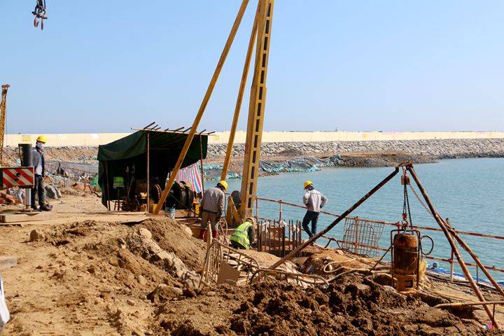 目前,東區(qū)油品碼頭工程,正在實施灌注樁施工,已經(jīng)完成23條。同時進行的還有基槽挖泥施工和靜載試樁平臺搭設(shè)以及沉箱底座鋼筋綁扎、建設(shè)梁板預(yù)制場,其中梁板預(yù)制場已經(jīng)完成80%的建設(shè)工程,即將具備預(yù)制開工條件。