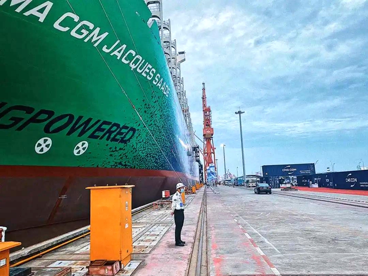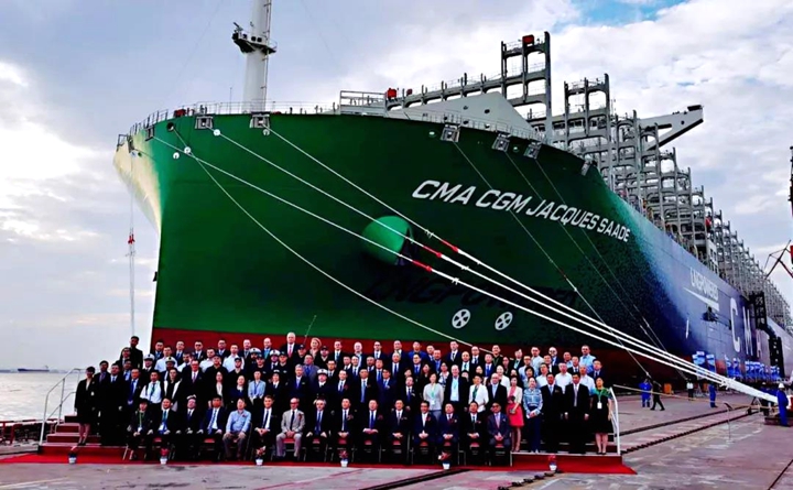 9月22日,中國船舶集團有限公司旗下滬東中華造船(集團)有限公司和中國船舶工業(yè)貿(mào)易有限公司作為聯(lián)合賣方,為世界著名航運公司——法國達(dá)飛集團建造的世界首艘23000TEU雙燃料動力集裝箱船“達(dá)飛雅克·薩德”號,在上海長興島造船基地命名交付。