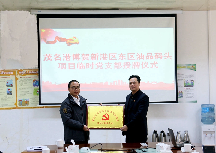 12月18日上午,茂名港集團(tuán)牽頭舉行博賀新港區(qū)東區(qū)油品碼頭項(xiàng)目工程臨時(shí)黨支部授牌儀式,集團(tuán)黨委副書(shū)記、工會(huì)主席肖炳璋為臨時(shí)黨支部授牌。臨時(shí)黨支部書(shū)記梁祖釗作表態(tài)發(fā)言并鄭重作出承諾。