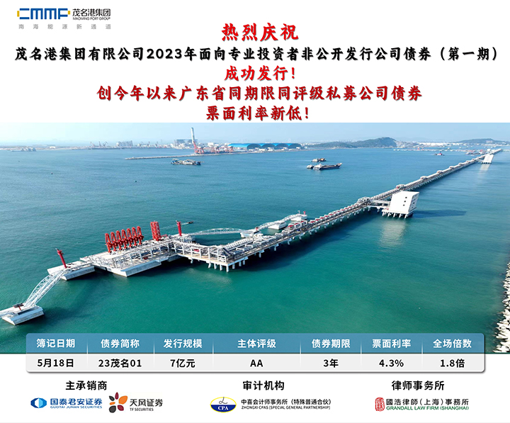 5月18日,茂名港集團2023年非公開發(fā)行公司債券成功發(fā)行,募集規(guī)模7億元,期限為3年,票面利率4.3%,創(chuàng)下今年以來廣東省同期限同評級同品種票面利率新低,為集團后續(xù)融資奠定了良好基礎(chǔ)。
