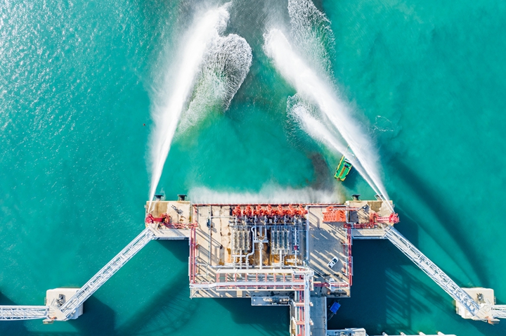 2023年12月7日下午,隨著公用工作樓首層消防泵房的紅色“巨獸”傳出一聲噪響,矗立10萬噸級(jí)成品油泊位兩側(cè)靠船平臺(tái)上的消防炮塔噴射出兩道水柱,標(biāo)志著茂名港博賀新港區(qū)東區(qū)10萬噸級(jí)成品油碼頭項(xiàng)目大型消防泵組和消防炮塔聯(lián)合運(yùn)行成功,為項(xiàng)目即將轉(zhuǎn)入運(yùn)營(yíng)提供消防安全保障。