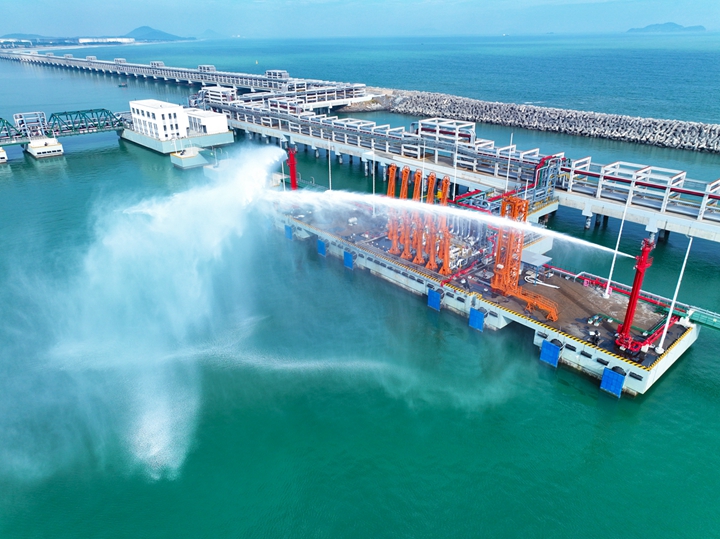 2023年12月27日,隨著8條“水龍”噴涌而出,博賀新港區(qū)東區(qū)化工碼頭消防系統(tǒng)聯(lián)運(yùn)調(diào)試工作取得圓滿成功,這標(biāo)志著繼油品碼頭之后,茂名港集團(tuán)化工碼頭也完成了由項(xiàng)目建設(shè)轉(zhuǎn)向生產(chǎn)運(yùn)營(yíng)的關(guān)鍵一環(huán)。