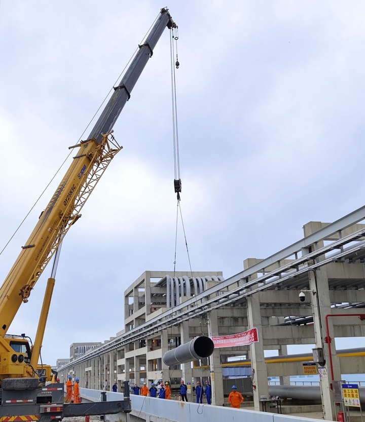 據(jù)悉,30萬噸級(jí)原油碼頭工程設(shè)置2根DN900的原油運(yùn)輸主管,起點(diǎn)為30萬噸級(jí)原油碼頭E1泊位,終點(diǎn)為東防波堤堤根的公用管廊終點(diǎn),原油管線總長(zhǎng)度約為6km,此次施工吊裝的首根原油管道長(zhǎng)約12.29米,重約3.46噸。公共管廊處管線多,作業(yè)空間狹隘,需要在保護(hù)已有管線設(shè)備的前提下進(jìn)行安全精準(zhǔn)化吊裝作業(yè),對(duì)此,臨時(shí)黨支部多次協(xié)調(diào)組織監(jiān)理單位、施工單位和運(yùn)營(yíng)單位的專業(yè)人員提前規(guī)劃管道吊裝方案,協(xié)調(diào)組織各方專業(yè)人員現(xiàn)場(chǎng)值守,從而保障管道吊裝作業(yè)安全可控地順利開展。