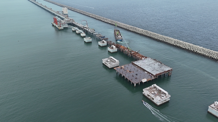 據(jù)悉,30萬噸級原油碼頭設計年吞吐量達1600萬噸,泊位長度達404米,碼頭共設計有145根樁基,由工作平臺及工作樓平臺的70根樁基和附屬管廊橋工程的75根樁基組成,其中工作平臺及工作樓平臺的70根樁基已于2023年底全部完工。