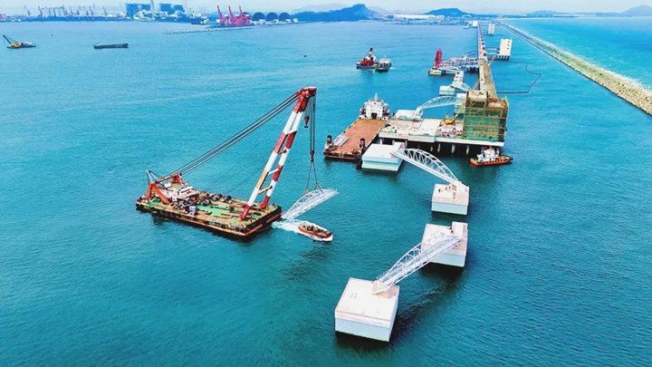 茂名港30萬噸級原油碼頭工程采用優(yōu)美的蝶形結(jié)構(gòu)設計,由1個工作樓平臺、2個靠船墩、6個系纜墩及8榀鋼聯(lián)橋組成,全長404米。其中,8榀鋼聯(lián)橋均為拱形結(jié)構(gòu),最大跨度達50米,單榀最大重量約60噸,是連接碼頭工作平臺、靠船墩和系纜墩的重要紐帶。由于鋼聯(lián)橋體積龐大、重量大,需通過駁船運輸至海上進行吊裝施工,面對海上作業(yè)環(huán)境復雜、天氣多變以及安裝精度要求高等多重挑戰(zhàn),30萬噸級原油碼頭項目經(jīng)理部充分發(fā)揮黨支部戰(zhàn)斗堡壘作用和黨員突擊隊的先鋒模范作用,提前謀劃施工方案、科學調(diào)配人員設備、精細把控安裝質(zhì)量、嚴格保障施工安全,高效推進鋼聯(lián)橋安裝工作,僅用不到2天時間便圓滿完成了全部安裝任務,展現(xiàn)了“茂名港速度”。