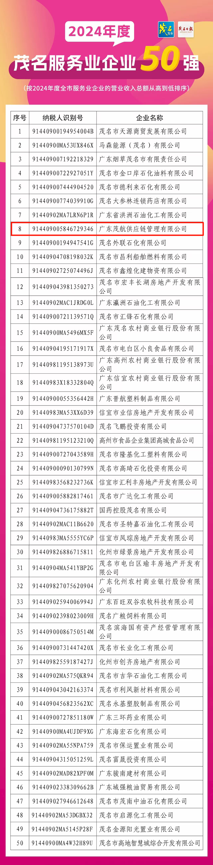 根據(jù)茂名市企業(yè)聯(lián)合會于2025年7月15日發(fā)布的通報,集團(tuán)下屬茂航供應(yīng)鏈公司以優(yōu)異的業(yè)績表現(xiàn)位列茂名企業(yè)100強第23位,較2023年第37位躍升14名,并首次躋身茂名服務(wù)業(yè)企業(yè)50強第8位。此次雙榜單的歷史性突破,標(biāo)志著茂航供應(yīng)鏈公司從傳統(tǒng)供應(yīng)鏈貿(mào)易商向供應(yīng)鏈科技企業(yè)的轉(zhuǎn)型取得實質(zhì)性成果。